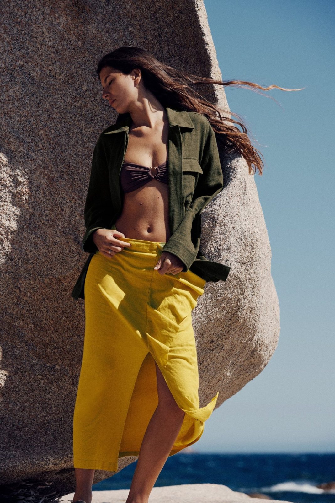 Confeccionada con mezcla de lino, tiene una abertura delantera adornada con unos volantes que pueden recordarnos a los trajes de flamenca. El cierre con cremallera se encuentra en un lateral y su tiro alto la hace muy favorecedora. Al ser de un alegre color mostaza podrás combinarla muy fácilmente con los tonos negro, verde, violeta, marino, beige o blanco. Su precio es de 25,95€.