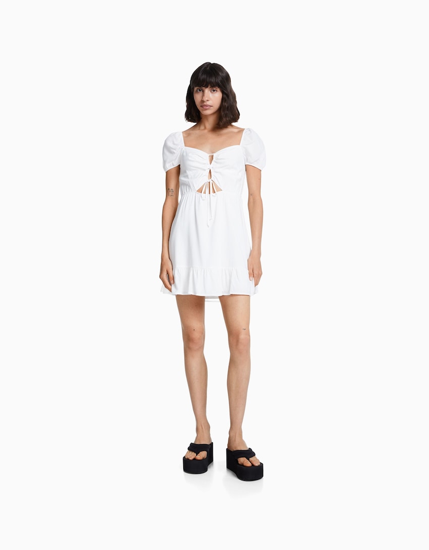 Comenzamos con un clásico de todos los veranos, el infalible vestido ibicenco. En esta ocasión Bershka presenta un diseño sencillo pero original, de un blanco impoluto, largo por encima de la rodilla y mangas ligeramente abullonadas. Destacan especialmente sus detalles cut out en el centro del escote y el abdomen, lo que le confiere un aspecto peculiar frente a otros vestidos de estilo similar.