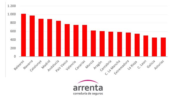 La siguiente tabla muestra el precio medio del alquiler con seguro de impago Arrenta en el primer semestre del 2023 (Euros al mes)