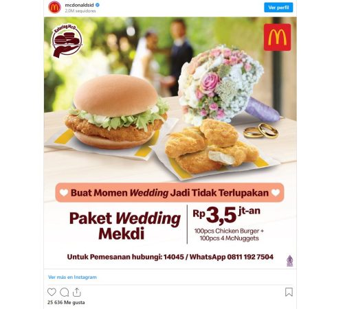 Indonesia ha sido el país que ha decidido innovar en este ámbito, y lo ha hecho con el paquete Wedding Mekdi. Este plan incluye 100 Chicken Burgers y 100 cajitas de McNuggets, con cuatro piezas cada una, a un precio que ronda -aproximadamente- los 200 euros. Teniendo en cuenta que una Chicken Burger para niños en España tiene un valor cercano a los cuatro euros, resulta una oferta imbatible para cualquier turista que se presentara en el país asiático.