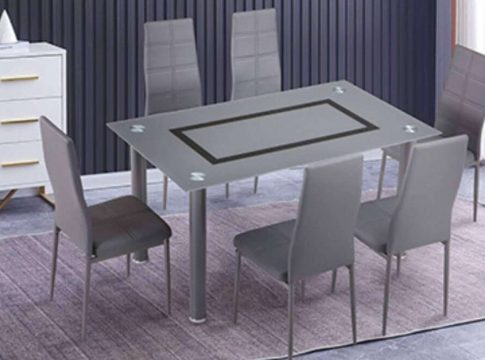 Este conjunto de muebles lo componen 6 sillas más una mesa de cristal. Por el lado de las sillas, estas son tapizadas con tela gris y tienen unas dimensiones de 98 cm de alto, 41 cm de ancho y 52 de fondo. Con respecto a la mesa de cristal, esta es fija y tiene unas dimensiones de 140 cm de largo, 80 de ancho y 75 de alto.