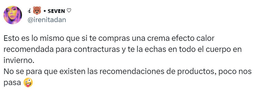 En cambio, otros usuarios no están tan conformes con el producto de Mercadona: “Yo lo he probado y es como si no me echase nada”, explica uno de los mensajes; y en otro podemos ver que hay quien lo rechaza: “Es igual que echarte Listerine por todo el cuerpo, la sensación es muy desagradable. Incluso hay quien advierte contra un uso indebido del gel: “Es como si te compras una crema efecto calor para contracturas y te la pones por todo el cuerpo en invierno, poco nos pasa”.