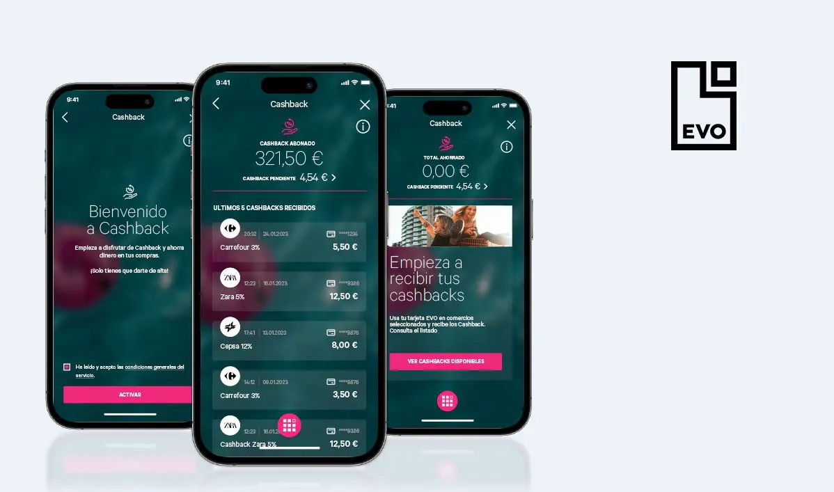 El nuevo servicio de Cashback se suma al ecosistema de innovaciones digitales de EVO y completa una propuesta comercial que sitúa las tarjetas de EVO entre las más atractivas del sector. A día de hoy EVO aúna su tarjeta de débito y crédito en un solo plástico físico o virtual, el cual ofrece flexibilidad de pago a preferencia del client , encendido y apagado digital en caso de robos o extravíos, seguro accidentes y viajes, cero comisiones así como una de las mayores redes de España para uso de efectivo. De este modo, ofrece retiradas gratuitas de efectivo a débito en España: acceso a una de las mayores redes del sector financiero con más de 18.000 cajeros gratis a débito sin cantidad mínima ni límite de retiradas. En cualquier otro cajero nacional también es gratis para retiradas a débito 200€ o más y la comisión que aplique ese cajero por la operación corre a cargo de EVO hasta los dos euros. EVO no cobra comisión por sacar dinero en extranjero.El nuevo servicio de cashback se suma al ecosistema de innovaciones digitales de EVO.