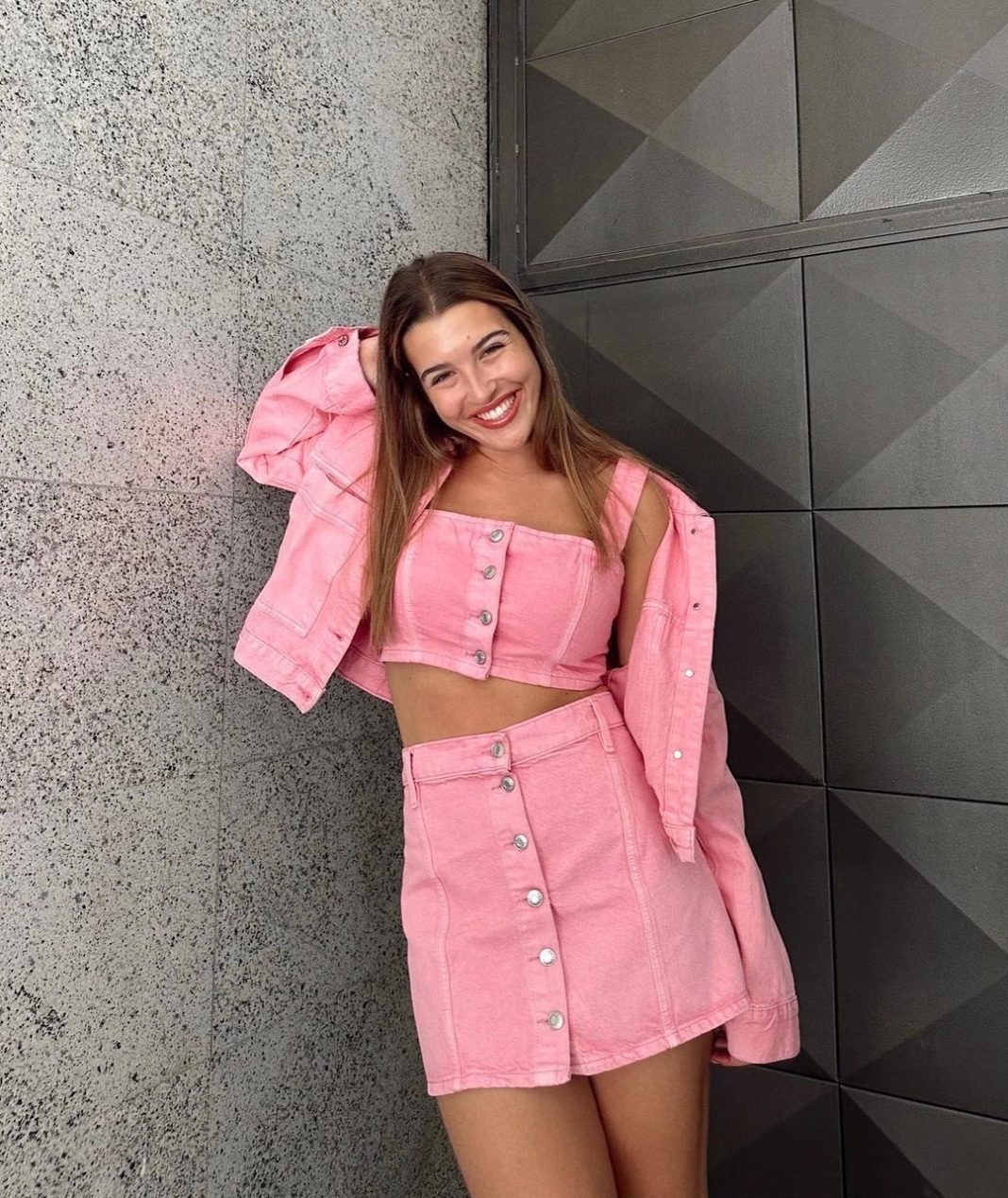 Para completar su look Alba Díaz ha elegido una falda mini de tiro alto que abarca casi todo vientre, con la misma botonadura frontal metálica que el crop top. Confeccionada en un tejido de algodón estilo vaquero, esta prenda muestra un diseño corto y recto, mientras que el cierre y las trabillas añaden unos detalles funcionales y decorativos, con un estilo realzado por las costuras decorativas. Viene en tallas desde XS hasta L, y Mango te lo ofrece por 29,99 euros.