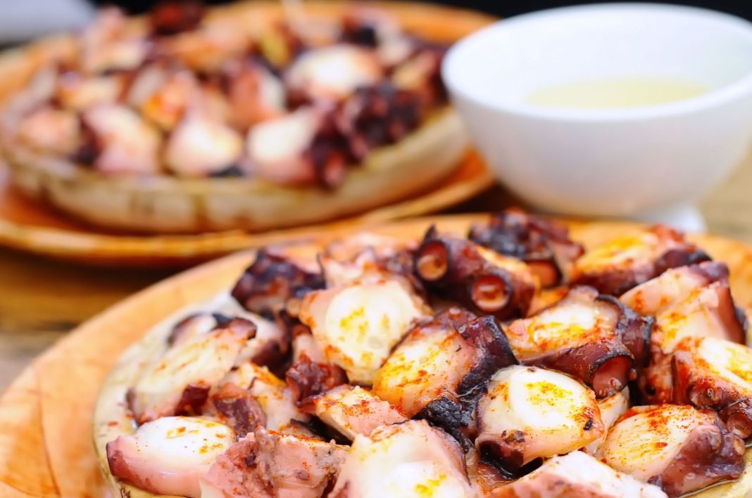 El pulpo a feira, también conocido como pulpo a la gallega, es un plato tradicional de la región de Galicia, en el noroeste de España. Tiene sus raíces en la rica tradición de la zona y sus orígenes se remontan a tiempos antiguos, cuando los pescadores gallegos lo preparaban en sus propias embarcaciones. Consiste en cocer el pulpo en agua con sal hasta que esté tierno, luego se corta en rodajas y se sirve sobre un lecho de patatas cocidas. El plato se adereza con sal gorda, pimentón y aceite de oliva, lo que le confiere su característico sabor.