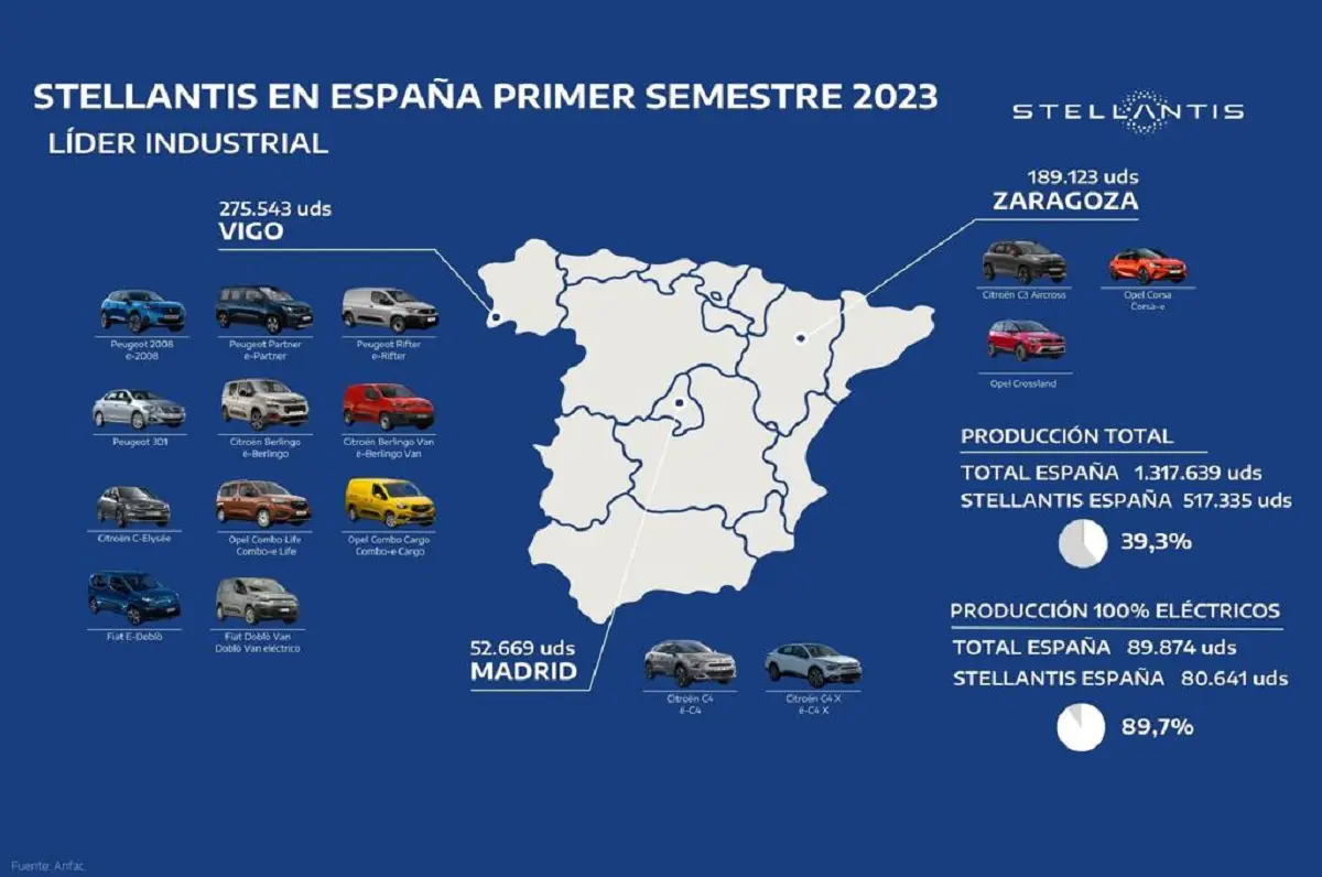 - Las plantas de Stellantis en España afianzan el liderazgo industrial del Grupo en nuestro país, con 517.335 vehículos producidos en Madrid, Vigo y Zaragoza en el primer semestre de 2023, lo que supone el 39,3% del total de automóviles producidos en nuestro país, según los datos publicados por ANFAC.