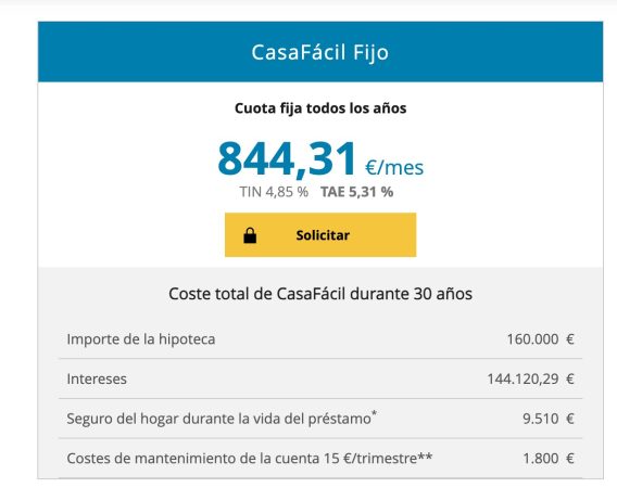A tipo fijo, las hipotecas rondan actualmente el 4%. Las hay del 5,3%, como es el caso de Caixabank, pero la norma general ronda una cifra más redonda. Con estos datos y dando por hecho que se ha pagado una entrada de 40.000 euros, en una hipoteca a 30 años la mensualidad que quedaría es de nada menos que de 844 euros al mes.