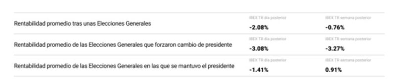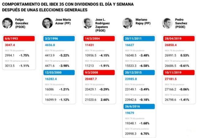 Hay incertidumbre en el país ante la situación política que dejan los comicios generales. Está por ver qué pasará y los parqués castigan la falta de claridad. “Especialmente duro fue el castigo que sufrió el selectivo tras la primera victoria de José María Aznar, con una caída del 5,22%. La incertidumbre provocada por el cambio, tras tres victorias consecutivas de Felipe González, fue suficiente para que los inversores dudasen sobre cómo se desarrollaría esta nueva etapa política”, apuntan en XTB. “La excepción de estas correcciones, la encontramos en el primer resultado electoral en el que Pedro Sánchez consiguió ser la lista más votada. En aquel entonces, el mercado celebró la continuidad en el gobierno sin mayores sobresaltos, y el índice subió un 0,53%”.