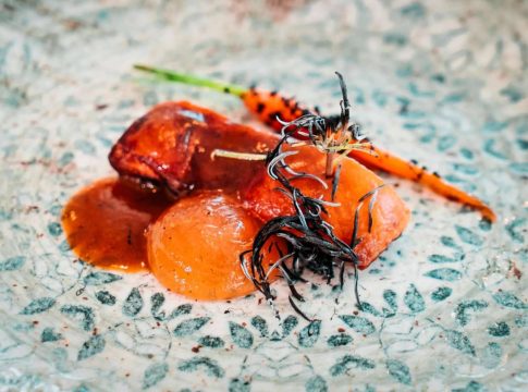 Finalmente, “Cochinillo con su demi-glacé” con una base de compota de manzana asada y una mini zanahoria y que viene a la mesa bajo una campana donde se ha concentrado un humo de leña y que al destapar impregna el ambiente. Es tanto como recrear la técnica de cocinarlo en horno de leña tal y como se cocina en Segovia en el famoso Mesón de Cándido, en el restaurante José María o en Coque de Madrid de Mario Sandoval con 2 estrellas Michelin. Intenso de sabor producido por la demi-glacé (fondo muy reducido de salsa, típico de la cocina francesa) y de piel crujiente.