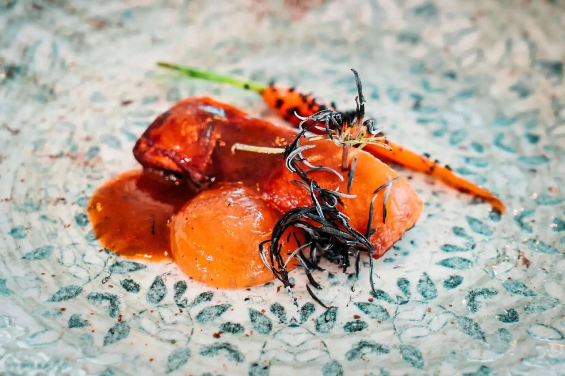 Otro plato, como el anterior elegante, es “Gamba blanca con emulsión de erizo de mar”. A la delicadez en textura y sabor de la gamba blanca, de la lonja de Villajoyosa, que se sirve cruda como un sashimi, se le contrapone un sabor profundo a mar con la emulsión de erizo de mar y azafrán. En referencia a los sabores de un arroz a banda o de un caldero se le añaden unos pequeños contrapuntos de alioli de mayonesa y un crujiente con tobiko (huevas de pez volador). Parece un arroz marinero al que, a última hora, se le hubiera olvidado ponerle el arroz. Fantástico y puramente mediterráneo.