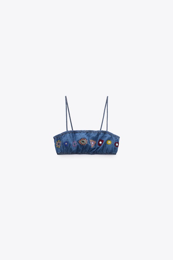 Durante el verano, es el momento perfecto para lucir crop tops, y si eres fan de esta prenda, sin duda te encantará este modelo que ofrece Zara. Se trata de un top corto confeccionado en tejido efecto denim. Presenta un escote recto y tirantes finos que realzan la figura. El detalle distintivo de este top son los bordados combinados a contraste y las aplicaciones efecto espejo que le dan un toque único y llamativo.