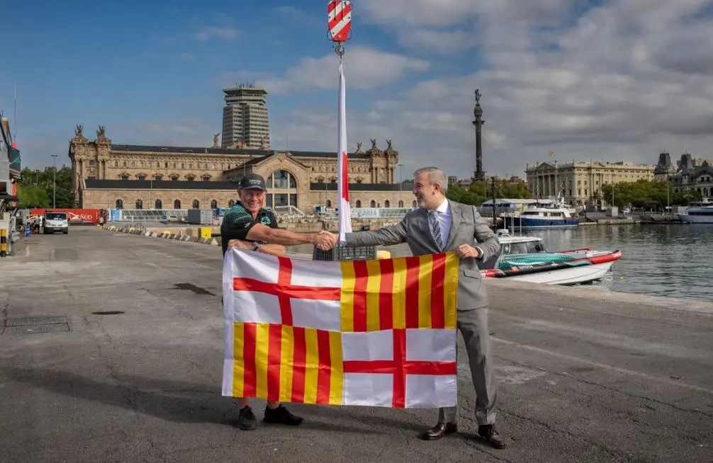 El alcalde de la ciudad, Jaume Collboni, hizo entrega de una enseña de la capital catalana al CEO de Emirates Team New Zealand, Grant Dalton y al COO, Kevin Shoebridge. En un acto cargado de simbolismo, la capital catalana ha querido agradecer al equipo neozelandés la selección de la ciudad como sede de la 37ª America’s Cup.