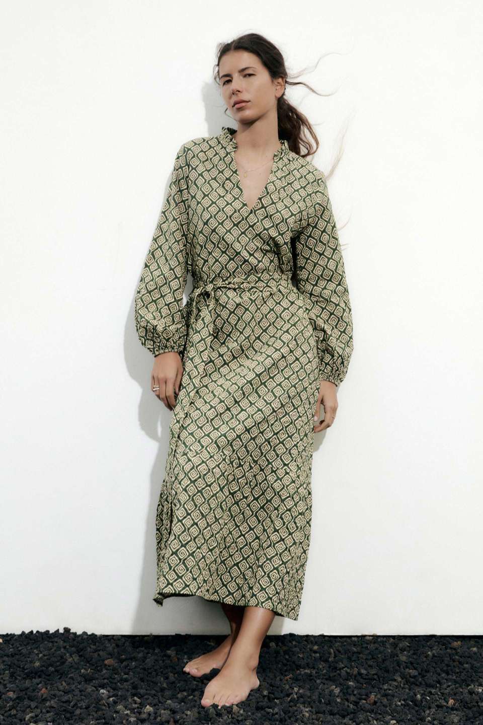 Este vestido largo de Zara es una verdadera joya de la moda. Con un estampado geométrico cautivador y mangas tendencia holgadas y cómodas, se convierte en una elección única y estilosa.