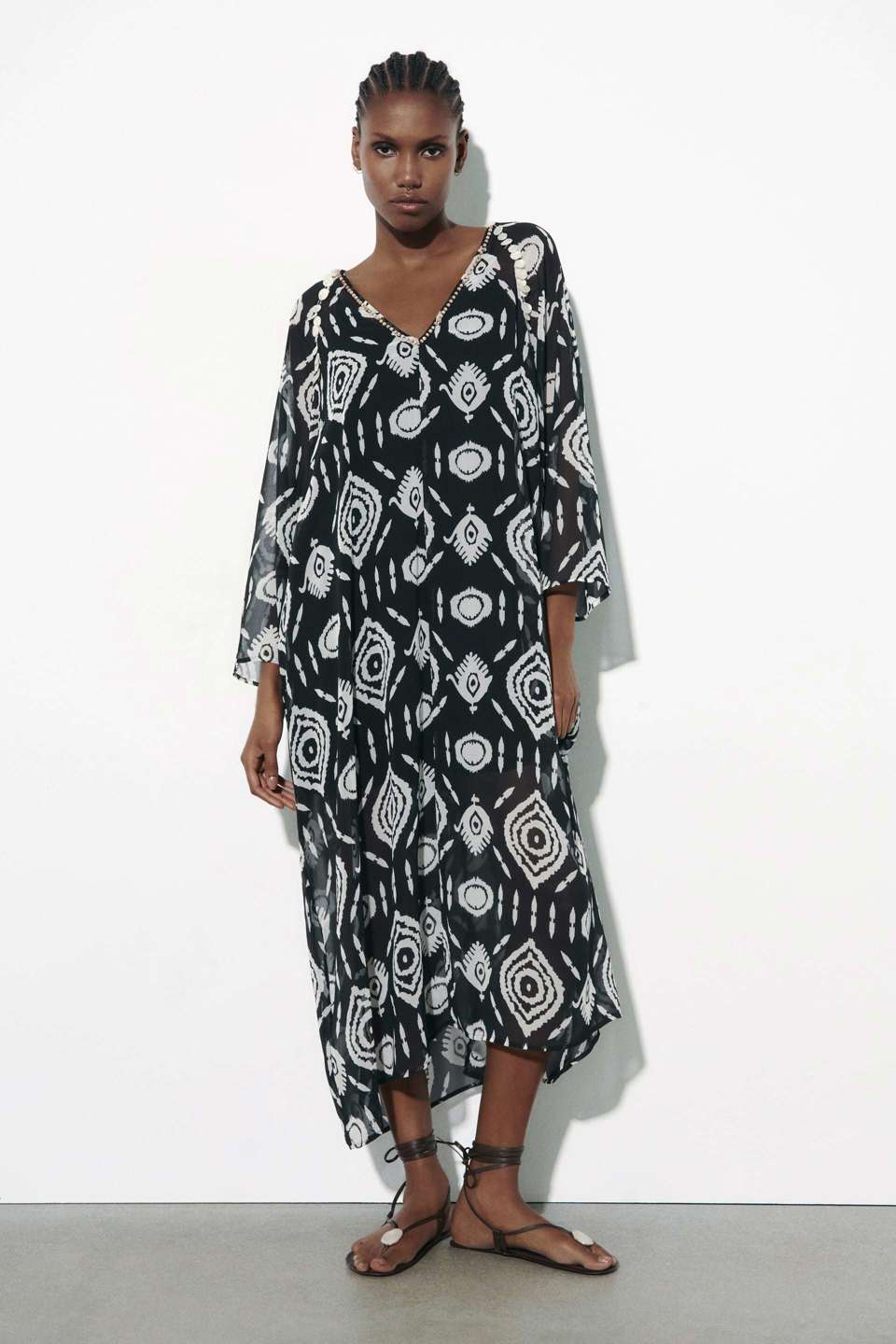 El vestido largo tipo caftán de Zara es un acierto para el verano, perfecto tanto para la playa como para eventos nocturnos. Su combinación de blanco y negro, con detalles originales como abalorios y un bonito estampado, lo convierte en una opción elegante y sofisticada.
