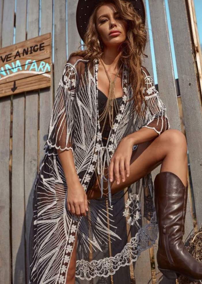 El kimono con transparencias es una prenda llena de detalles que la hacen única y especial. Desde su estampado hasta sus transparencias, pasando por sus mangas con ondas y los bordados que lo adornan, este kimono es una pieza elegante que elevará tus looks a otro nivel.