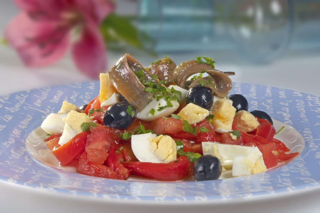 Esta ensalada es mucho más que una simple ensalada campera, en la que se mezclan ingredientes; es una sinfonía de sabores. La combinación de pimientos asados, aceitunas, cebolla, pepino y un toque de ajo y vinagre crea un equilibrio perfecto entre lo dulce y lo salado. Además, el aceite de oliva virgen extra realza todos los sabores y aporta una textura suave y sedosa que se desliza en cada bocado.