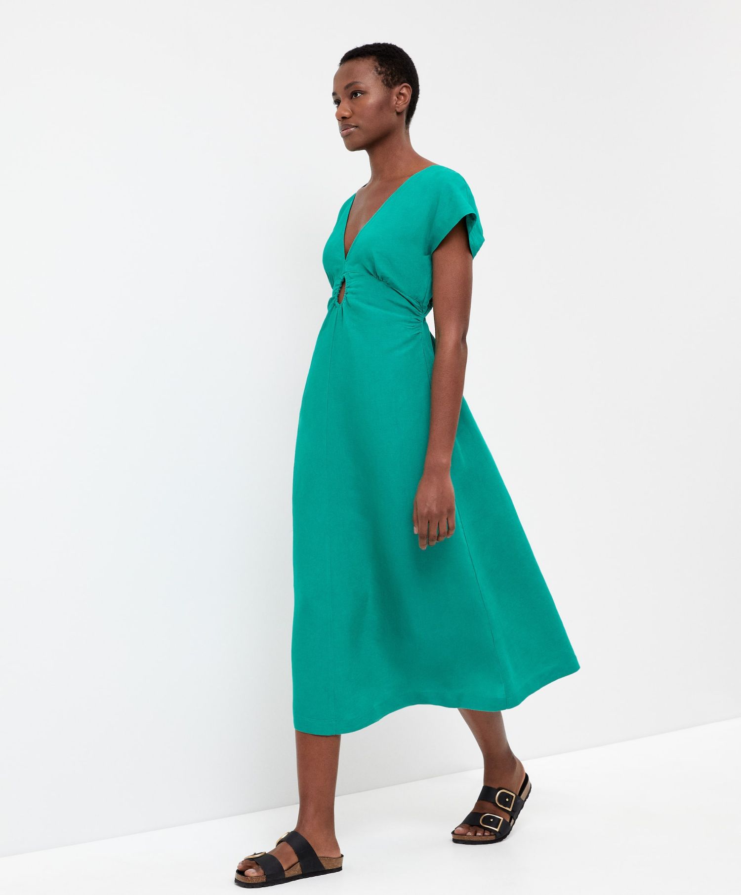 En Oysho siempre “toman prestadas” las ideas de Mango y otras firmas, y el conjunto de Leonor no ha escapado a esta estrategia. Esta versión también es un vestido midi de manga corta y escote en pico, si bien reemplaza los botones por detalles cut out sobre la cintura, además de en la espalda. Su composición de un 50% de lino garantiza que irás fresquita este verano, además está disponible en tallas XS a L. La única contraprestación es su precio, que en el caso de Oysho sube hasta los 45,99 euros.