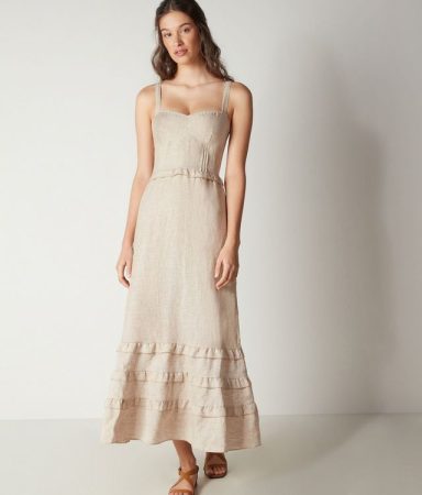 El vestido en cuestión es un diseño de lino en color crudo natural, con un favorecedor bustier en la parte superior y elegantes volantes en el bajo de la falda, que le aportan un toque romántico. Con una longitud midi, este vestido es una opción fresca y cómoda para los días calurosos de verano. Además, su versatilidad lo convierte en la elección perfecta para una ocasión especial en la que se desee elevar el estilo sin perder la frescura característica del verano. ¡Atraerás todas las miradas!