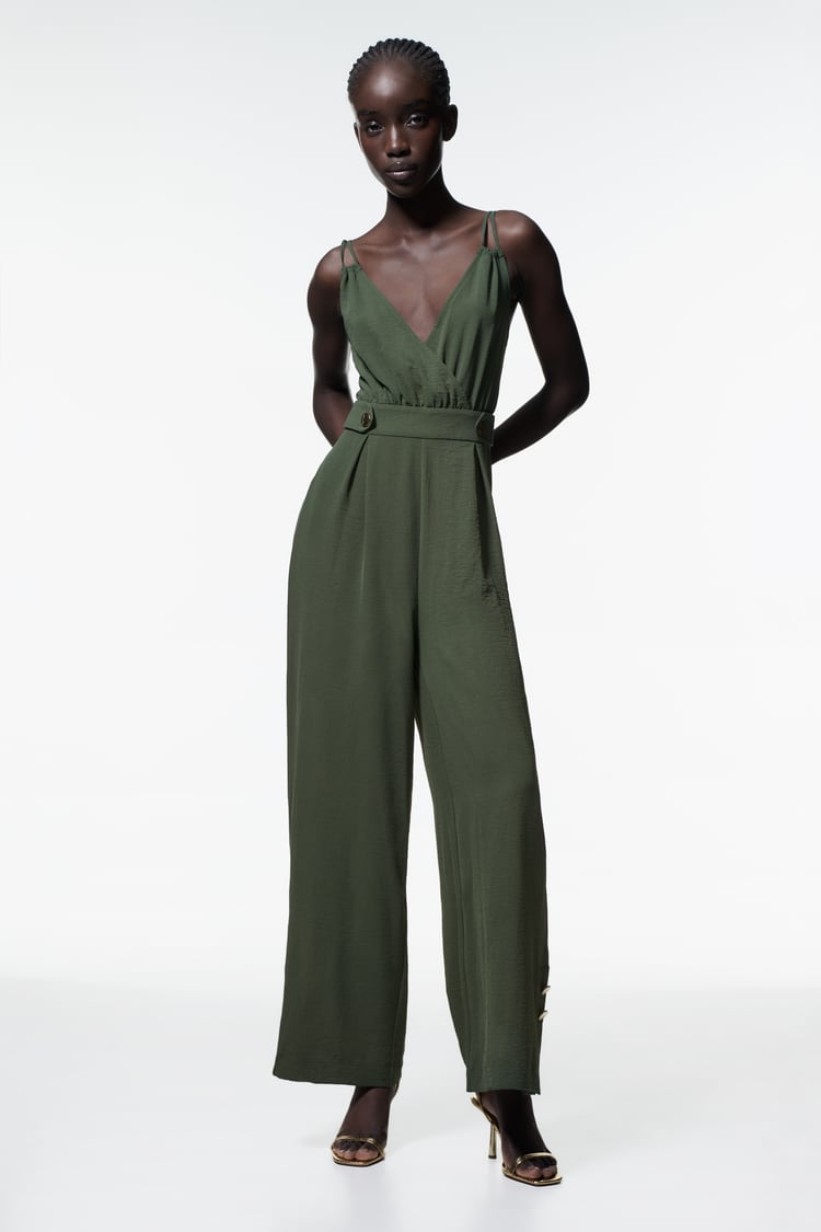 La firma gallega nos propone así un mono largo con botones dorados, escote en pico y doble tirante fino. De color caqui, cuenta con un detalle de pinzas delanteras y con falsos botones a la altura de la cintura. La pernera es ancha y el bajo tiene aberturas laterales con botones. El cierre, con cremallera oculta entre la costura, está en la parte posterior.