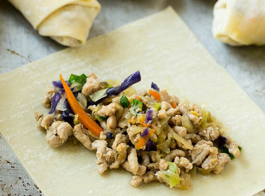 Vamos ahora con el paso más divertido de todos. Primero, coge una lámina de pasta wanton y echa dos o tres cucharadas de relleno en la parte inferior. Tienes que doblar los extremos encima del relleno y enrollarlo sobre sí, y para que no se despegue, en la última vuelta aplica un poco de huevo batido. Haz lo mismo con el resto de láminas hasta agotar todo el relleno, y reserva los rollitos de primavera: puedes meterlos en la nevera, o incluso congelarlos para más adelante.