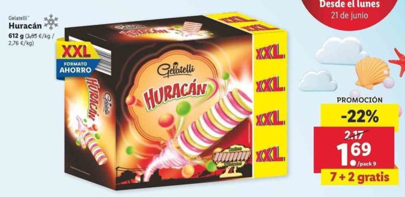 En la categoría de helados de leche, uno de los productos mejor calificados según la OCU es el «Huracán», producido por la marca Gellatelli y disponible en la cadena de supermercados Lidl a un precio asequible de 1,69 euros por un paquete de siete unidades.