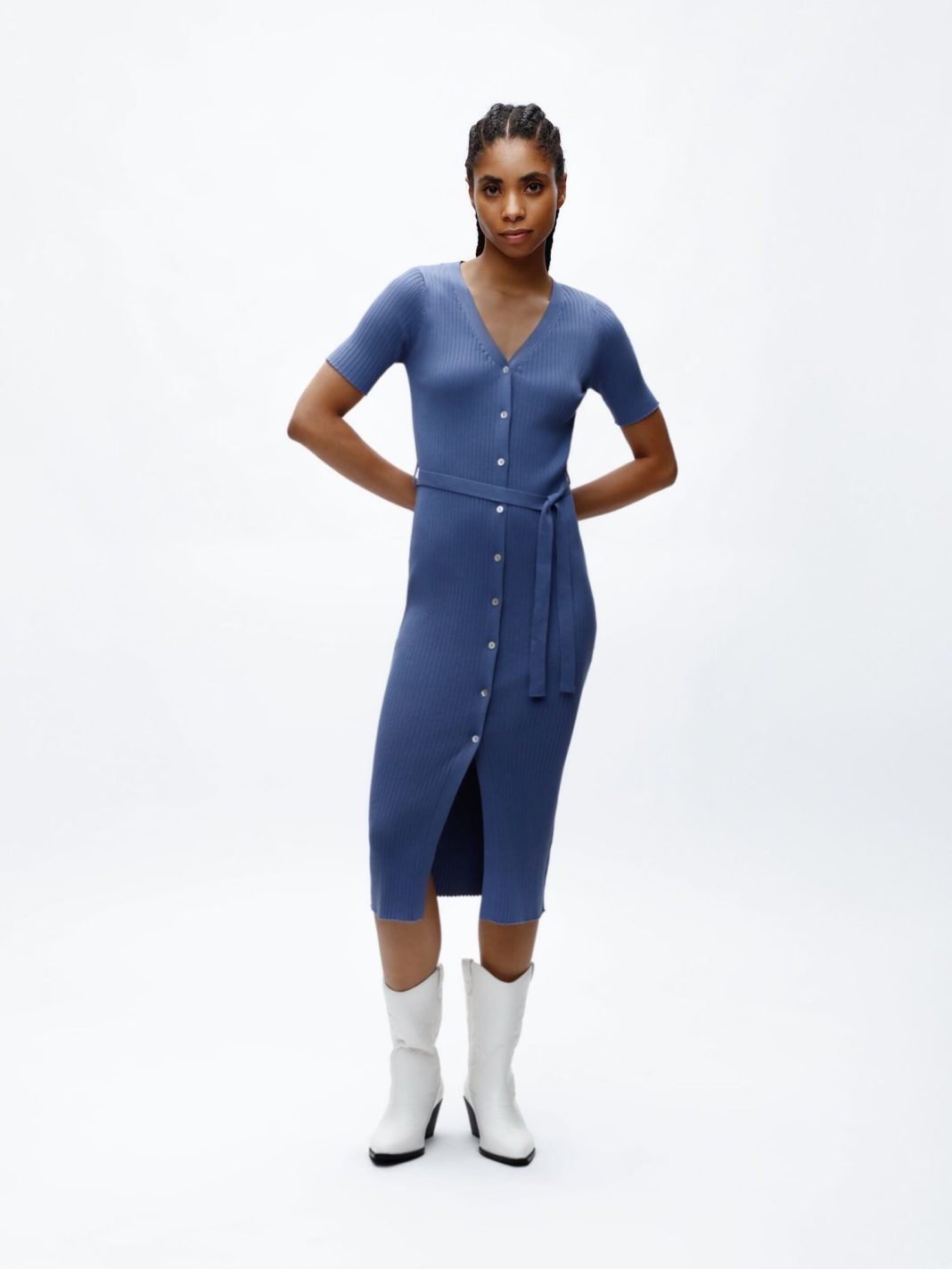 ¡Aquí llega el vestido perfecto para destacar tu estilo! Este midi de canalé de punto, con su cuello en forma de pico y mangas cortas, te dará una imagen fresca. Los botones delanteros y el cinturón son pura tendencia, mientras que el tejido de viscosa se adapta a tus curvas y te mantiene cómoda todo el día. Combínalo con zapatillas blancas para un look casual ‘Made In Lefties’, que te lo ofrece por 17,99 euros.