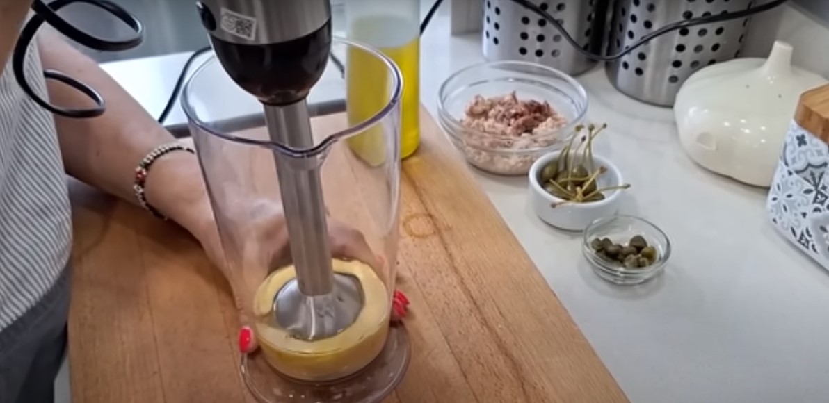 5. Una vez que la mayonesa esté bien montada, añade el atún y las anchoas picadas. Bate ligeramente nuevamente para que estos ingredientes se integren perfectamente en la mezcla.