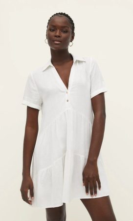 Los básicos de verano no estarían completos sin prendas de lino blanco, y este año, más que nunca, el lino es el tejido por excelencia. El vestido camisero de lino blanco es un ejemplo perfecto de esto.