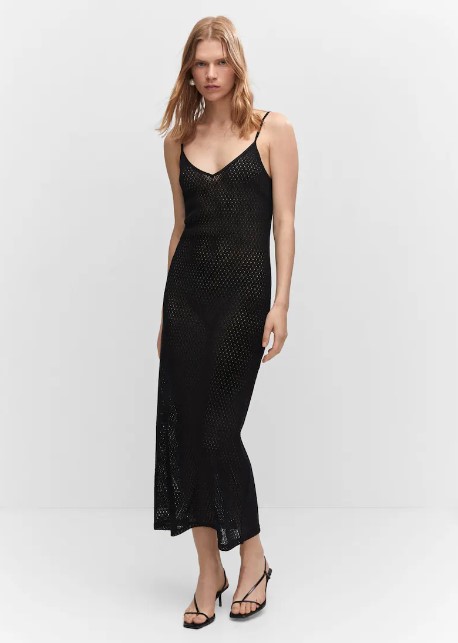 Eleva tu estilo veraniego con el Vestido Largo de Punto Calado de Mango. Confeccionado en un tejido de punto calado, este diseño entallado se caracteriza por su longitud y su cuello escotado, realzado por tirantes finos y una espalda con escote que añade un toque coqueto. Perfecto para la temporada de festivales y momentos casuales bajo el sol.