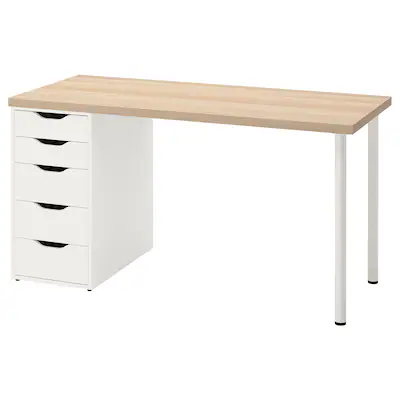 Los agujeros previamente perforados en el tablero simplifican el proceso de montaje de las patas. Las asas integradas en la cajonera no solo aportan un toque distintivo, sino que también mejoran la facilidad para sujetar y abrir los cajones. El escritorio presenta un acabado en efecto roble con toques blancos, y sus dimensiones son 140×60 cm. Disponible en Ikea por un precio de 129 euros. El precio es de 199 euros, además cuenta con garantía de 10 años.