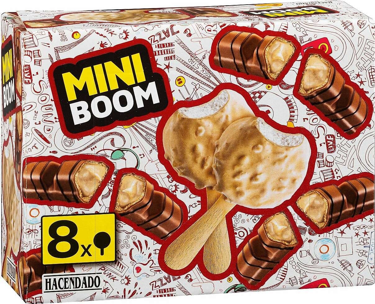 Vamos a terminar con mini boom, el último de los helados del supermercado valenciano. Se trata de un helado hecho de barritas de chocolate y avellanas, muy similares al Kinder Bueno que todos conocemos. Es un helado redondo de pequeño tamaño, recubierto con la crema de avellanas y con una textura muy cremosa, a la cual se le añaden trozos de barquillo crujiente.