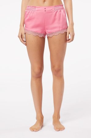 Por último y para completar tu conjunto de dos piezas, hemos seleccionado el siguiente pantalón corto de pijama de satén con motivos de tul, un “delicado pantalón corto de satén y tul para esas noches especiales que no quieres renunciar a sentirte cómoda y chic”. El tul se caracteriza por tener un tacto extremadamente suave y vaporoso, que lo hace perfecto para crear estilos ligeros y delicados.