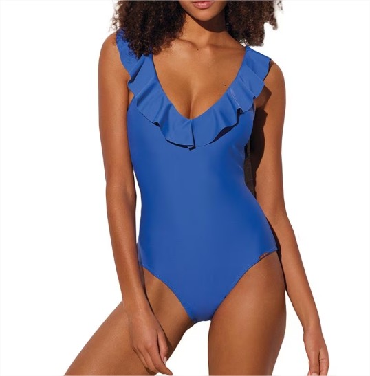 El bañador de mujer reductor con copa B y volante es otra gran opción en la venta privada de El Corte Inglés. Este bañador cuenta con un diseño estampado veraniego y un volante encantador que aporta un toque femenino.
