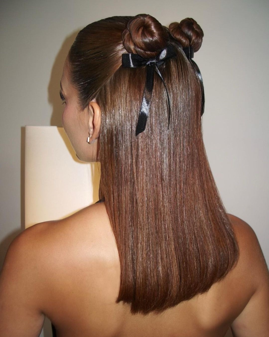 El semirrecogido pulido y tirante, caracterizado por su estética nostálgica que rememora la década de 2000, requiere unos cuidados para que te quede tan bien como a Laura Escanes. En la peluquería deben hacerte un cepillado minucioso y aplicar de productos alisadores para lograr la pulcritud y suavidad deseadas. Luego, se separa una sección central de cabello que se recoge con firmeza, y el pelo suelto se alisa con planchas, creando un efecto de contraste marcado.