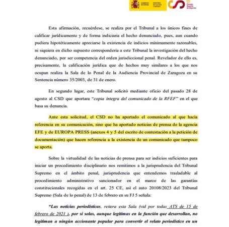 Asimismo, indica que el Tribunal solicitó mediante oficio del pasado 28 de agosto al CSD que aportara “copia íntegra del comunicado de la RFEF” en el que basa su denuncia y agrega que, “ante esta solicitud, el CSD no ha aportado el comunicado al que hacía referencia en su comunicación , sino que ha aportado noticias de prensa de la agencia EFE y de Europa Press (anexos 4 y 5 del escrito de contestación a la petición de documentación) que hacen referencia a la existencia de un comunicado que tampoco se aporta”.