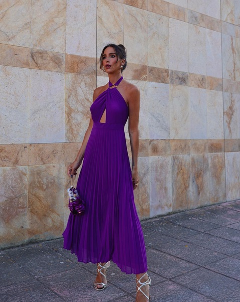 Se trata de un vestido de largo midi, color morado intenso, de estilo plisado, y un cuello halter que incluye una hebilla dorada y una lazada trasera en el cuello que cae por la espalda.