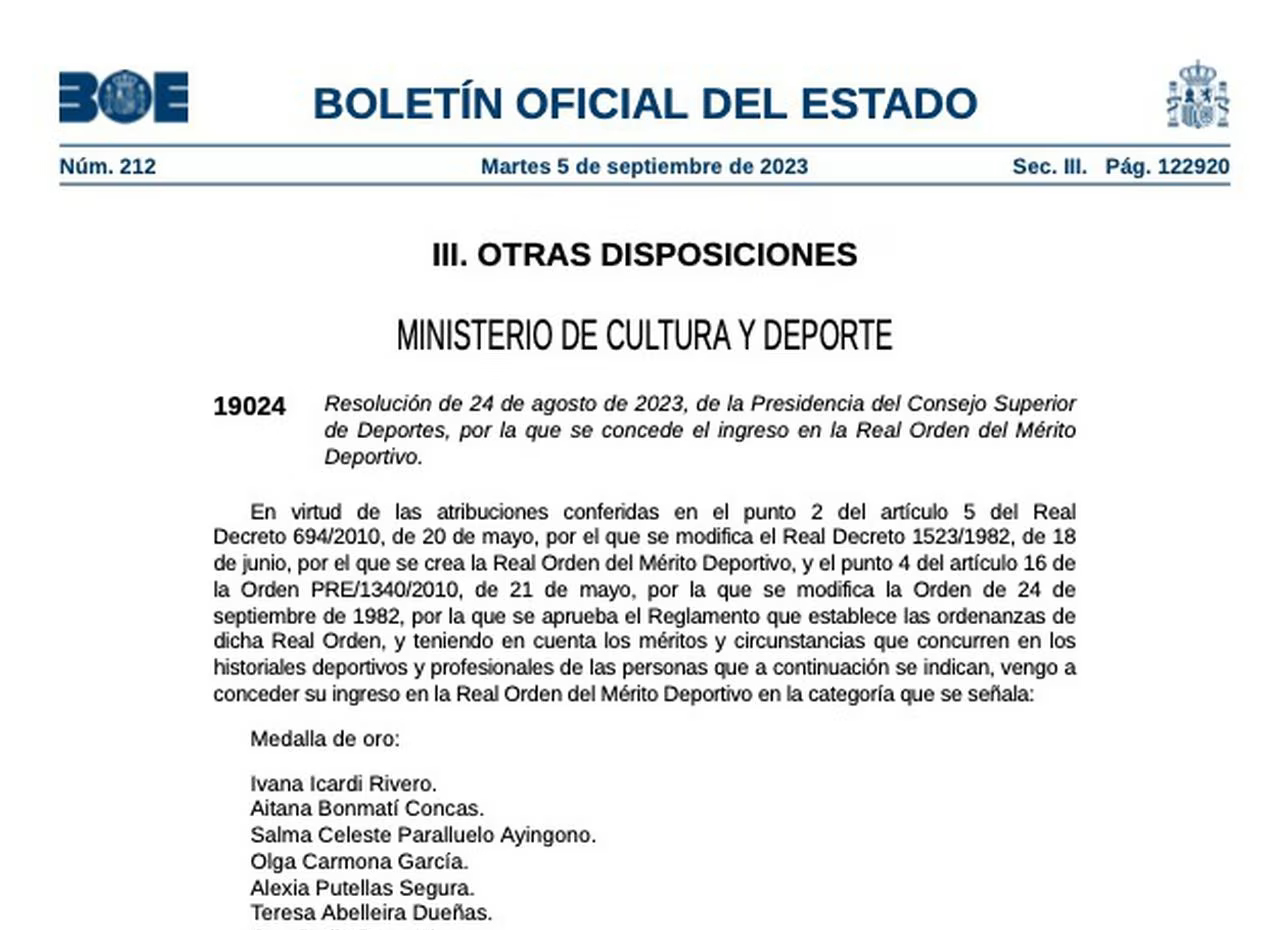 El 5 de septiembre el Boletín Oficial del Estado traía buenas noticias: la Selección Española de fútbol femenino va a recibir la medalla de oro al Mérito Deportivo, como premio a su triunfo en el Mundial y en homenaje a los méritos de en sus historiales deportivos y profesionales. La publicación parecía correcta, con el listado de las jugadoras al completo, encabezadas por Ivana Andrés… ¡Pero había un error garrafal! En lugar de su nombre figuraba el de Ivana Icardi Rivero.