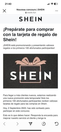 La usuaria de Instagram una vez entro dentro del enlace le redirigieron a una página en español que puede llegar a confundir ya que arriba aparece el logo de la marca china, Shein. Lo que ofrecían estos ciberdelincuentes era una tarjeta de regalo de Shein que solo ganarán los 100 primeros afortunados. En el mensaje si bajas un poco hay una frase que descubre que esto no es legal ni tiene nada que ver con Shein, «Hoy 2 de septiembre de 2022, has sido sorteado para participar en este concurso». Si nos fijamos bien podemos observar que la url de la página web (wsele.fun) es falsa.