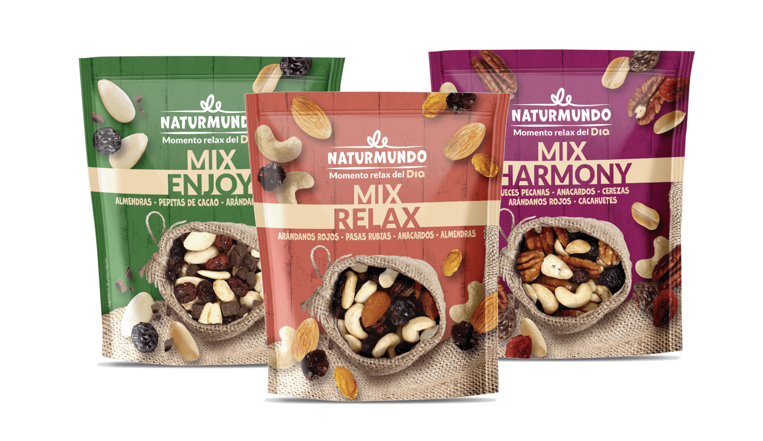 Dia presenta tres nuevas y deliciosas combinaciones de frutos secos en su gama Naturmundo: Mix Enjoy, Mix Relax y Mix Harmony, ideales como snacks saludables para la vuelta a la rutina que, además, ahora se pueden encontrar en bolsas de 40gr para llevarlas a cualquier parte. Con estas novedades, Dia ya cuenta con 35 variedades de sus frutos secos. Una fuente de energía saludable y llena de sabor, ricos en fibra, minerales y vitaminas.