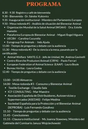Como punto de partida, la primera mesa redonda con el título «Análisis de la situación del Bienestar Animal» y la participación de la Dra. Estelle Hamelin, de la Organización Mundial de la Salud Animal (WOAH), de Miguel Ángel Higuera, de la Plataforma Europea de Bienestar Animal, Carolina Cucurella, de la UECBV, e Inés Ajuda del Eurogroup For Animals, hará una exposición sobre cuál es la situación actual del bienestar animal a nivel europeo.