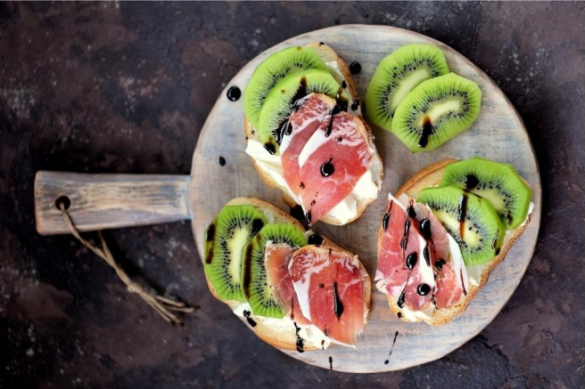 2TOSTA CON KIWI, QUESO Y JAMÓN SERRANO
