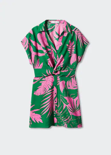 Por último, no podemos dejar de mencionar otro tipo de vestido que se encuentra en máxima tendencia: el estilo camisero. En Mango, puedes encontrar un diseño de este tipo con un estampado tropical que se convertirá en tu uniforme de verano. El vestido está confeccionado en un tejido fluido, tiene un corte recto y es de longitud corta. Cuenta con un cuello camisero y mangas cortas, así como un cierre de botones en la parte delantera. Además, presenta un nudo en la cintura para realzar la figura. Está disponible en tallas plus size para adaptarse a diferentes siluetas. Está compuesto por un 83% de viscosa y un 17% de poliamida. Puedes elegir entre los colores verde y negro, y su precio es de 29,99 euros.