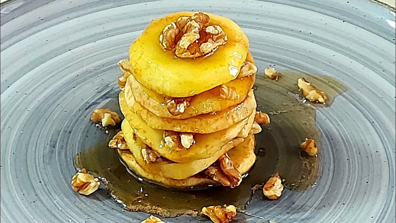 Cada capa de hojaldre se entreteje con finas láminas de manzana caramelizada y trozos de nueces tostadas, todo esto coronado con un toque de miel que realza sus sabores naturales.