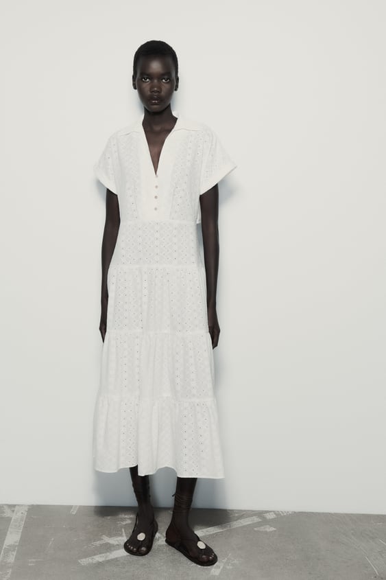 Zara nos propone este vestido camisero de longitud midi, cómodo y favorecedor, decorado con delicados bordados perforados. Tiene un cuello con solapa, con un escote en forma de pico y mangas cortas con vueltas en sus extremos. Cierra mediante botones en la parte delantera. La prenda está confeccionada en algodón al 100% y está disponible por un precio de 45,95 euros.