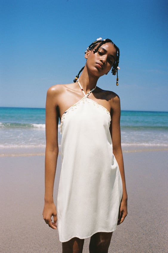 Si buscas un vestido especialmente fresco y ligero, este modelo de Zara es perfecto para ti. El vestido está confeccionado con una mezcla de tejido de lino, y está diseñado con un cuello estilo halter, que se anuda al cuello con unas lazadas elaboradas con hilos bordados en tonos vivos. Tiene detalles decorativos de abalorios y cierra en la espalda con una cremallera oculta en la costura. El vestido lleva un forro interior para mayor comodidad. Está disponible a un precio de 29,95 euros.