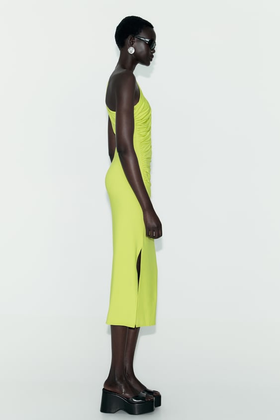 El Vestido Shape Asimétrico Drapeado de Zara es una auténtica joya de la moda que ha conquistado los corazones de las fashionistas más exigentes. Con su diseño midi, este vestido nos brinda una combinación perfecta entre elegancia y comodidad. Su escote asimétrico y manga sisa le confieren un toque sofisticado y moderno, perfecto para destacar en cualquier evento o reunión.