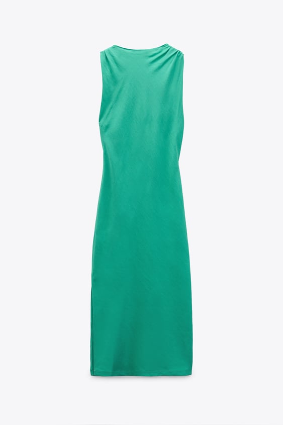 El vestido frunce con lino de Zara es una pieza de moda excepcional. Este vestido midi se ha creado con una mezcla de lino y viscosa que lo hace fresco y cómodo. Su diseño presenta un cuello amplio y mangas sisa, realzadas con detalles de frunce y pliegues que añaden un toque sofisticado.