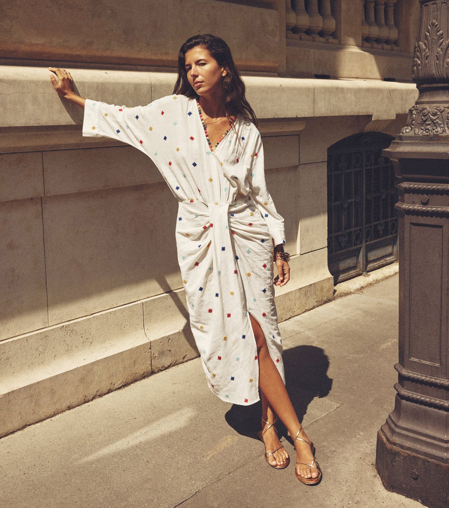 Nos encanta los pliegues que tiene en la cintura, ya que consiguen un efecto ‘tipazo’ que estiliza la figura, mientras que los detalles de los pompones y bordados son encantadores. Tiene una particularidad, y es que su estilo bohemio es al mismo tiempo moderno, gracias al bajo asimétrico y el lazo que remata la cintura. ¡Es irresistible! Además se presta a toda clase de looks, como el que luce Rocío Osorno y otras muchas propuestas.