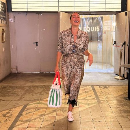 El look de Ana Milán para este día especial consistió en un «total look» de animal print con dos prendas de Sfera: una blusa de manga larga y una falda midi de corte suelto y fluido. Combinó este conjunto con unas zapatillas blancas icónicas de la marca Converse, un bolso tipo shopper que aportaba un toque de color y diseño audaz, y sus gafas de sol XXL características.