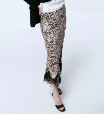 La falda presenta un tiro alto y un bajo festoneado de encaje negro, un toque elegante y con un aire lencero que la hace especial y adecuada tanto para looks de día como de noche, dependiendo de cómo se combine. La versatilidad de esta prenda la convierte en un elemento imprescindible en el armario de cualquier mujer que desee estar a la moda.